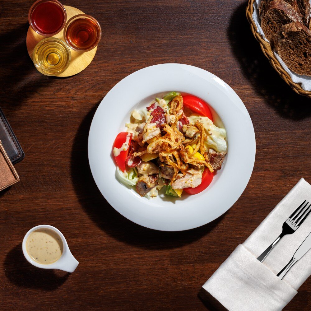 Говядина, бекон, куриное филе, салат айсберг, томаты, жареные грибы и картофель, лук фри и горчичный соус.