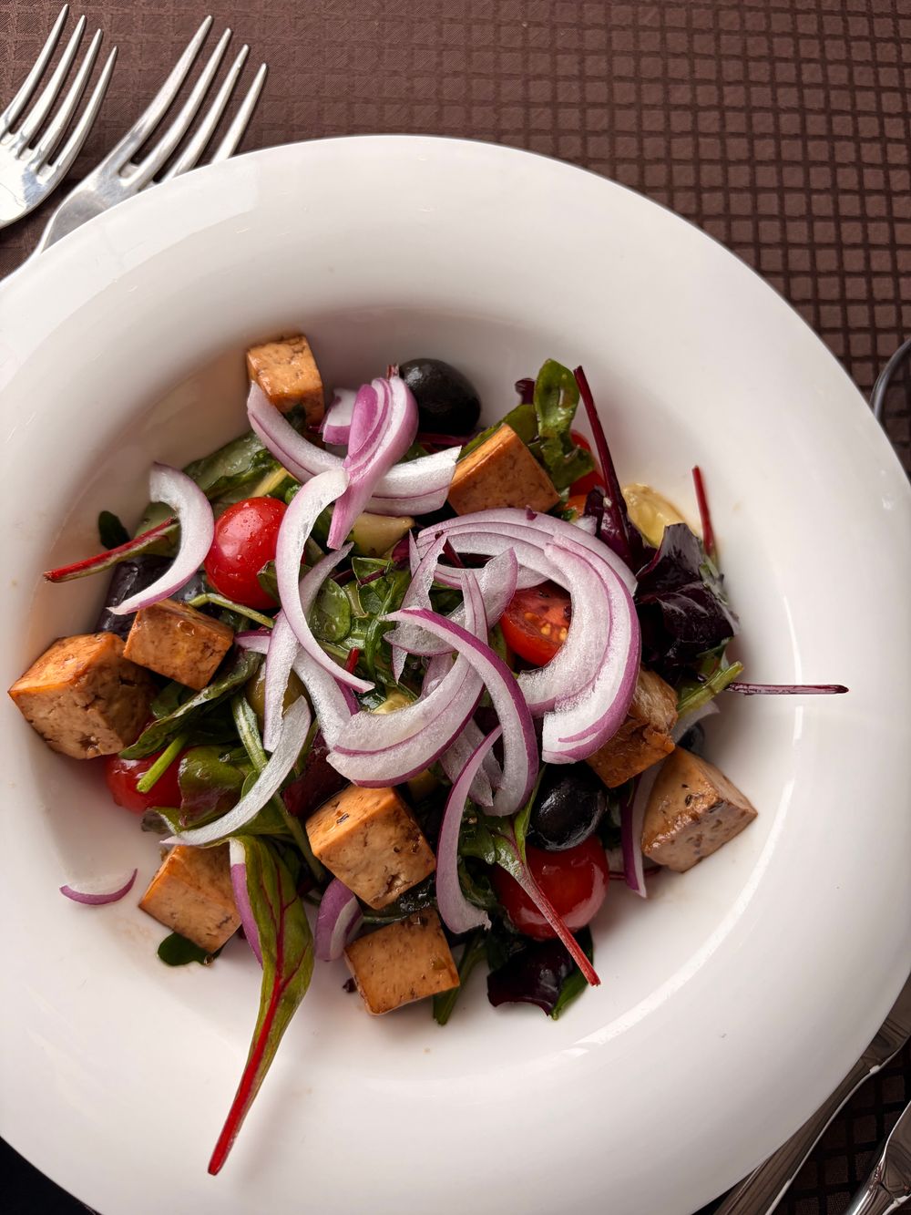 Огурцы, томаты, тофу, микс салатов, маслины, оливки, лук красный, масло оливковое, крем бальзамический, соус соевый, лимон, орегано.