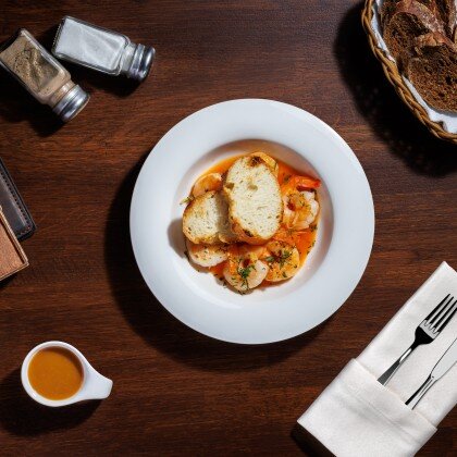 КРЕВЕТКИ В СЛИВОЧНОМ СВИТ ЧИЛИ С ХРУСТЯЩИМ БАГЕТОМ